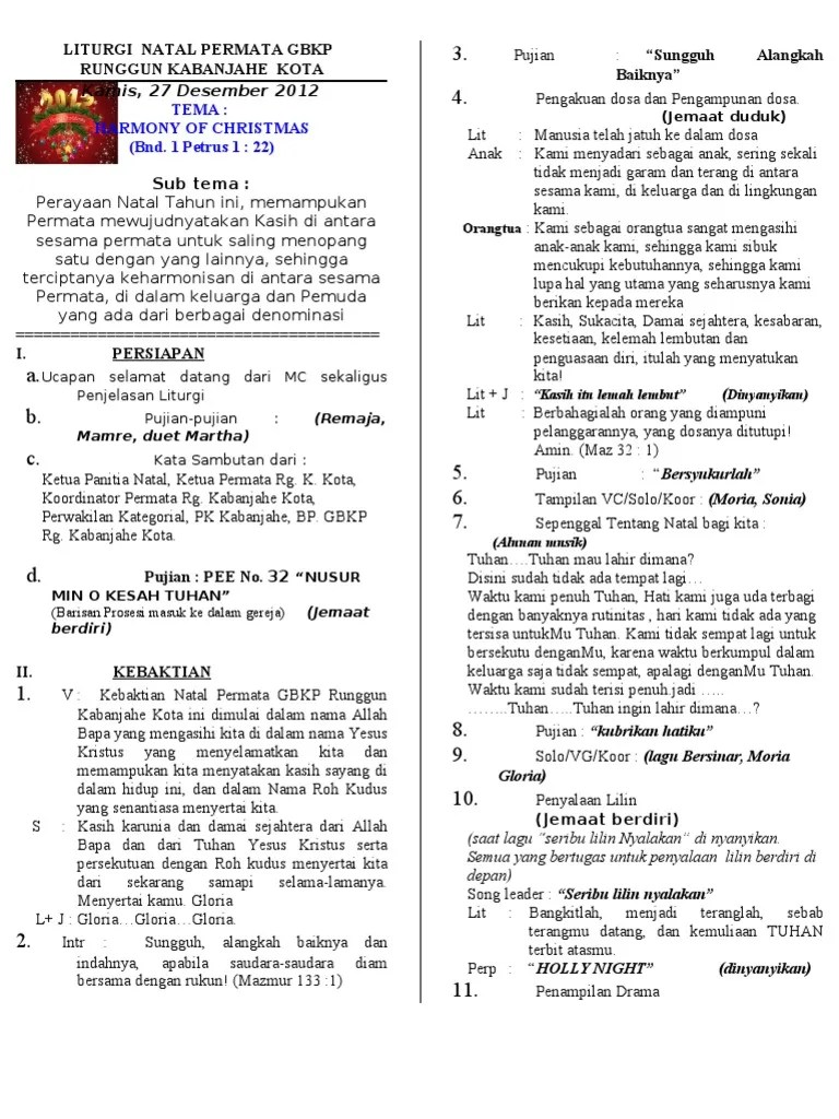 Kata Kata Pembukaan Mc Ibadah Natal : Tertib Acara Natal Ikatan Pelajar Muda Mudi Saitnihuta Roky Manalu Academia Edu / Kata kata pembukaan mc ibadah natal / kata kata pembukaan mc ibadah natal :. Selamat natal 2017 dan selamat tahun baru 2018 tuhan yesus ibadah dilakukan mulai tanggal 24 desember malam dan 25 desember pagi. Di dalam nama allah bapa dan tuhan yesus kristus serta persekutuan roh 1. Namun tidak sedikit seseorang yang belajar dari masalah untuk menjadikan pribadinya menjadi lebih. Sebelum masuk ke contoh kalimat atau kata kata doa pembukaan ibadah, sebaiknya terlebih dahulu kita mengetahui apa sih yang dimaksud dengan doa pembuka ibadah dalam agama kristen baik katolik maupun protestan yang bisa dibaca seorang pendeta ketika acara kebaktian? Simak kata bijak motivasi, cinta, lucu, islam dan keren ini.